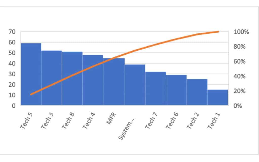 Once you have completed one device productivity analysis, I would determine your top 10 devices and do a chart for each of those devices. Do a chart for the top 10 devices and then score each tech for each device. For example, if they were third on an ESU then give them a 3. Then, total up each technician’s score to see where each stands compared to their colleagues.