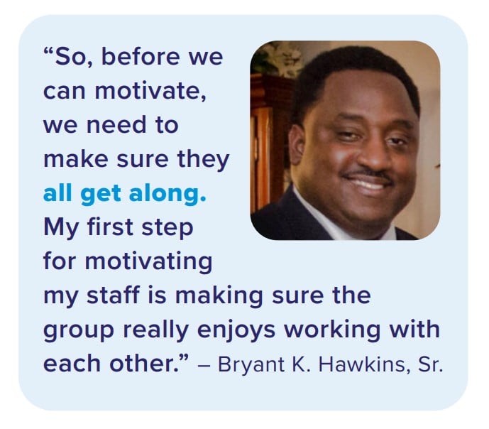 “So, before we can motivate, we need to make sure they all get along. My first step for motivating my staff is making sure the group really enjoys working with each other,” Hawkins says.