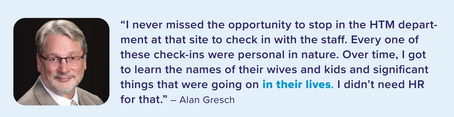 “I never missed the opportunity to stop in the HTM department at that site to check in with the staff. Every one of these check-ins were personal in nature. Over time, I got to learn the names of their wives and kids and significant things that were going on in their lives. I didn’t need HR for that,” Gresch says.