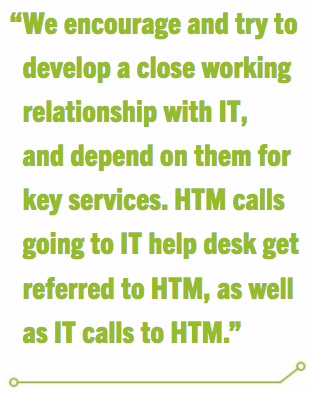 “However, our CE-IT team integrates with the hospital’s IT department in regards to computer owned hardware, hospital switches, and hospital interfaces. We encourage and try to develop a close working relationship with IT, and depend on them for key services. HTM calls going to IT help desk get referred to HTM, as well as IT calls to HTM,” Herr adds.