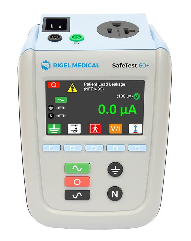 The Rigel SafeTest 60+ is a medical safety analyzer designed for high-volume testing of medical and laboratory equipment. It ensures compliance with NFPA 99 standards by performing essential applied parts tests, including patient current leakage and insulation measurements, to guarantee electrical safety.
