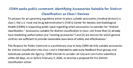 FDA’s Center for Devices and Radiological Health (CDRH) issued a request for public comment on December 5, 2025, seeking feedback on the distinct classification of existing medical device accessories into Class I. The notice reflects FDA’s ongoing efforts to classify accessories based on their own risks and necessary controls, not merely by reference to the parent device’s class. Comments are due by February 3, 2026, at Docket No. FDA-2025-N-6224.