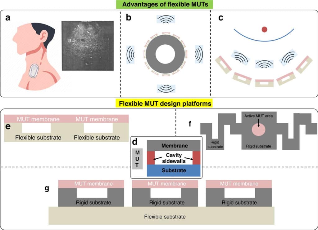 “On the other hand, flexible CMUTs are emerging demonstrating proof of concept for imaging. Flexible PMUTs remain the most recent one with significant optimization challenges. Nevertheless, with sustained research, flexible MUTs have the potential to close the gap with other mature ultrasound modalities and unlock new opportunities in wearable ultrasound to aid diagnostics and disease prevention.”
