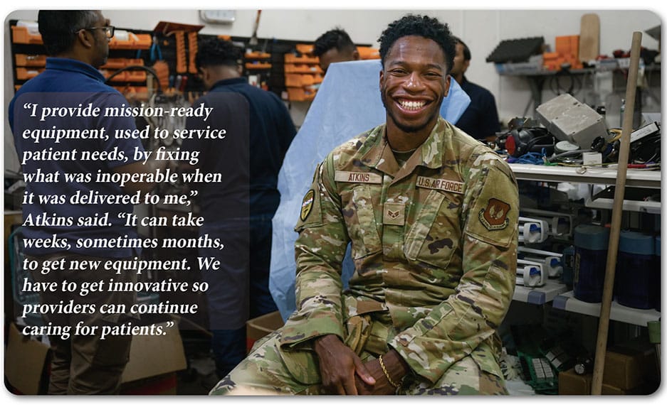 “I provide mission-ready equipment, used to service patient needs, by fixing what was inoperable when it was delivered to me,” Atkins said. “It can take weeks, sometimes months, to get new equipment. We have to get innovative so providers can continue caring for patients.”