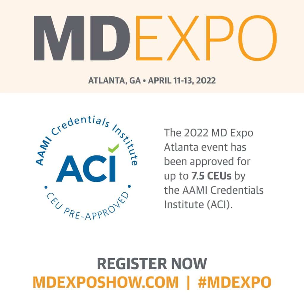 The 2022 MD Expo Atlanta event has been approved for up to 7.5 CEUs by the AAMI Credentials Institute (ACI).