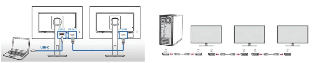 When daisy-chaining displays, it’s best for each monitor to use the same port, either DisplayPort or USB-C. This is a general statement for operability and is not always the case. Some monitors with integrated docking stations allow USB-C to support multiple DisplayPort monitors. On DisplayPort, the first monitor must use an upstream port, with a built-in hub potentially used thereafter. On Thunderbolt displays, each monitor requires both input and output ports, allowing daisy-chaining as setup and chain limits permit. Thus, one USB-C connector can handle up to five monitors. This is limited mostly by the video card’s bandwidth and memory capacity.