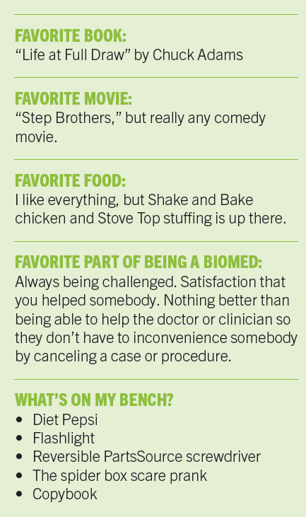 The many years in consumer electronics allowed Shearer to leapfrog into a BMET 2 position and then eventually become a BMET 3. He does not have a particular specialty, but describes himself as a “jack-of-all-trades.”