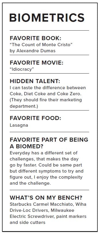 “I had a good friend/mentor in the military reserves, who was in the BMET profession. He spoke highly of the career and the training that he received from the military. My unit was closing due to reorganization of our ‘combat hospital’ and I was offered to reclass into BMET since my previous job as a radiology tech was unavailable,” Campbell says.