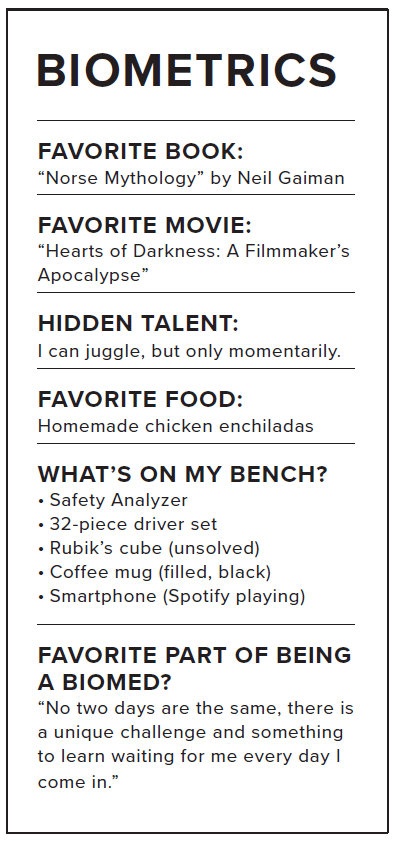 He took a slightly different route in college and finished with an AAS in electronics and computer controls with two supplemental certifications — electronics technician and computer controls technician. After graduating, he was met with some offers in different industries, but the health care offers wanted someone with existing experience. He thought that he might have to go in another direction and miss out on biomed.