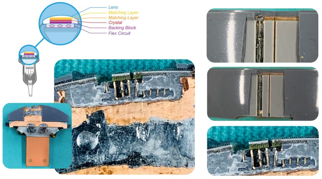 I really enjoy working with Innovatus clients. One area that I particularly enjoy is sharing failure analysis data and helping clients understand root cause to potentially prevent future recurrences. It can be frustrating to HTM teams, and end-users, to learn that their ultrasound probe that was only sent in to address a damaged strain relief may require a more invasive repair. Two of the most-common failures with ultrasound probes are intermittent or broken wires in the cable harness and damaged elements in the acoustic array. Let’s take a look at the latter.