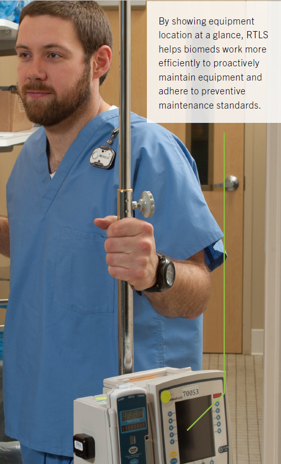 - Clinical/Biomedical Engineering: Assets are easier to find for preventive maintenance (PM) and recalls. With RTLS, more equipment can be serviced in less time, improving productivity and patient safety.