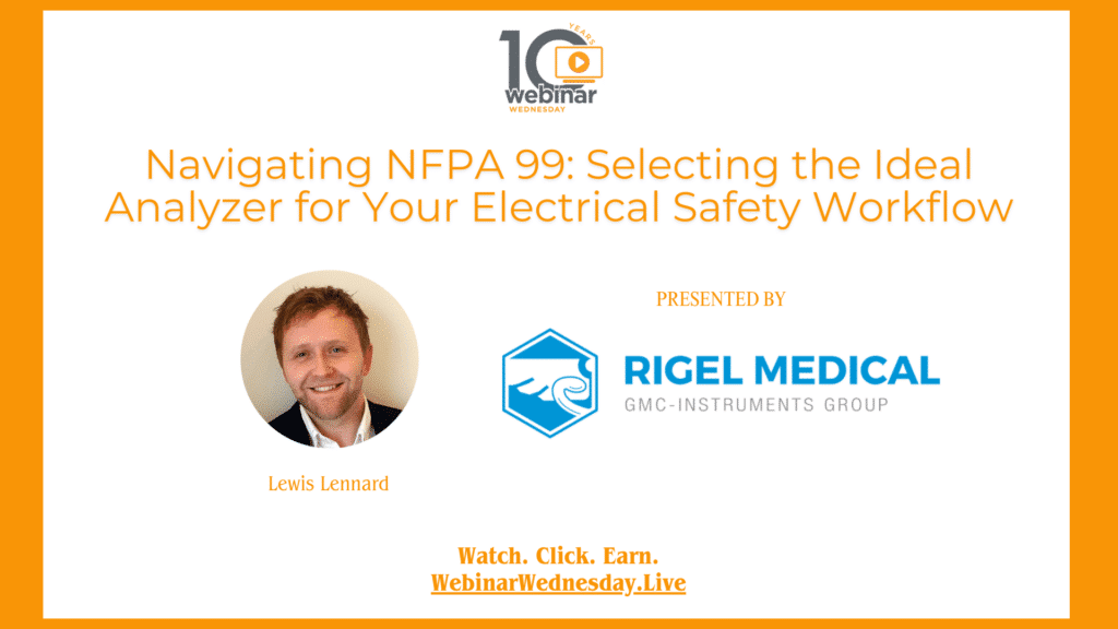 The TechNation Webinar Wednesday recently continued its 10-year anniversary celebration with the session “Navigating NFPA 99: Selecting the Ideal Analyzer for Your Electrical Safety Workflow.” The webinar, sponsored by Rigel Medical, is eligible for 1 credit from the ACI.