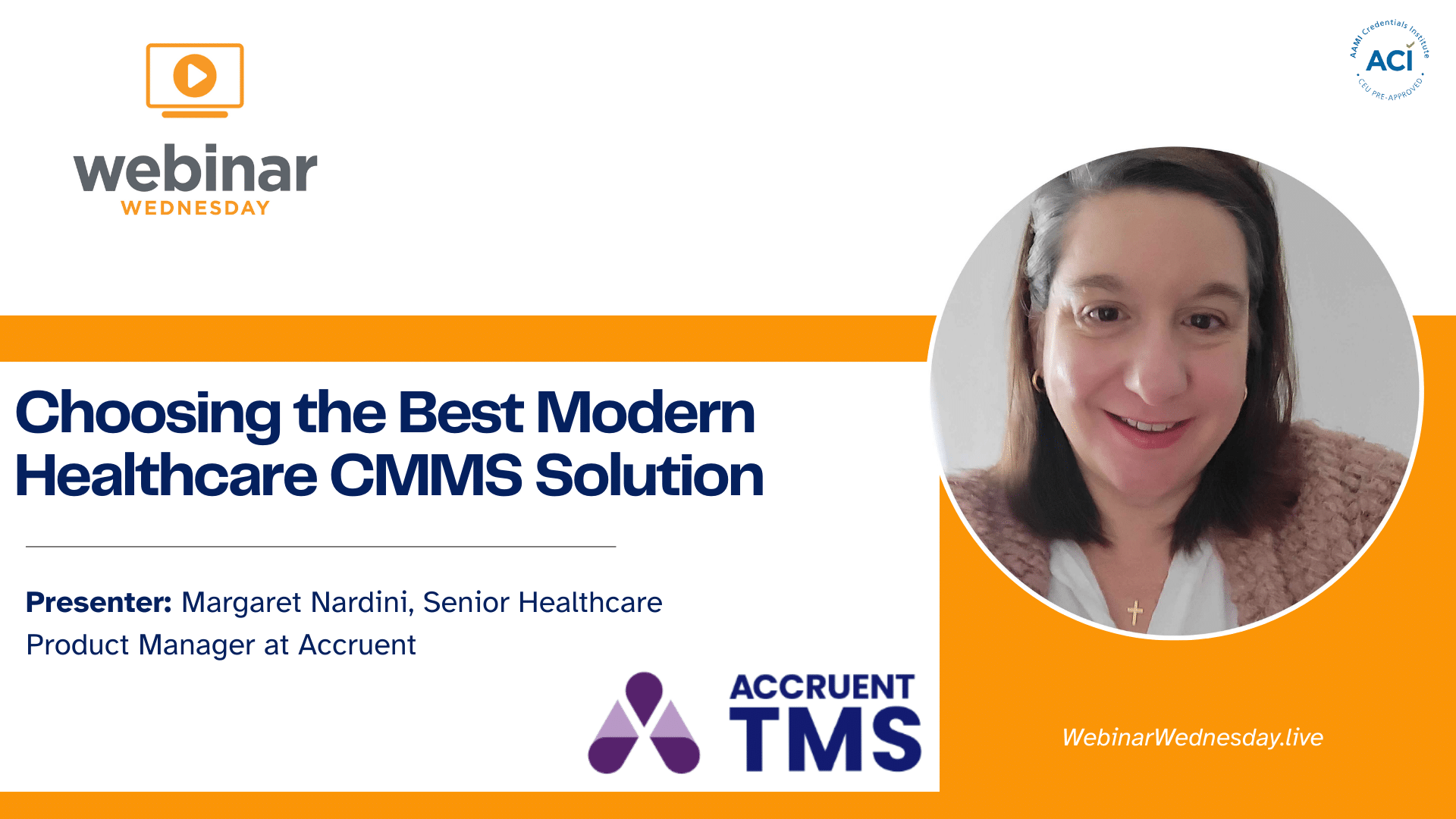 The recent Webinar Wednesday session “Choosing the Best Modern Healthcare CMMS Solution” presented by Margaret Nardini, Senior Healthcare Product Manager at Accruent, was sponsored by Accruent. It is eligible for 1 CE credit from the ACI
