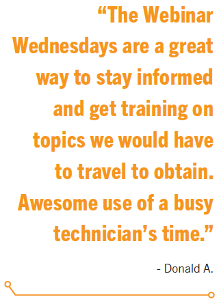 “The Webinar Wednesdays are a great way to stay informed and get training on topics we would have to travel to obtain. Awesome use of a busy technician’s time,” Donald A. wrote.